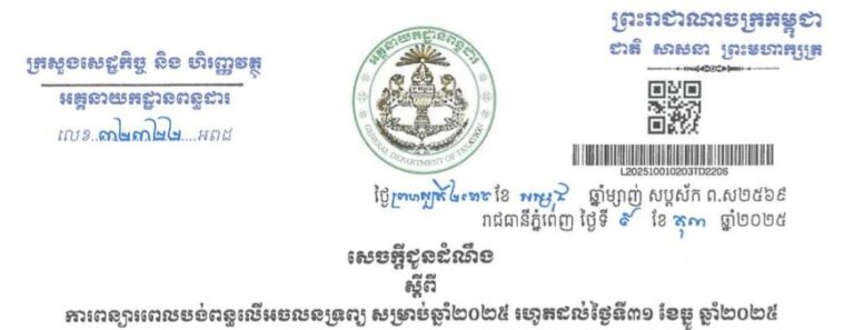 សេចក្តីជូនដំណឹង ស្តីពី ការពន្យារពេលបង់ពន្ធលើអចលនទ្រព្យ សម្រាប់ឆ្នាំ២០២៥ រហូតដល់ថ្ងៃទី៣១ ខែធ្នូ ឆ្នាំ២០២៥