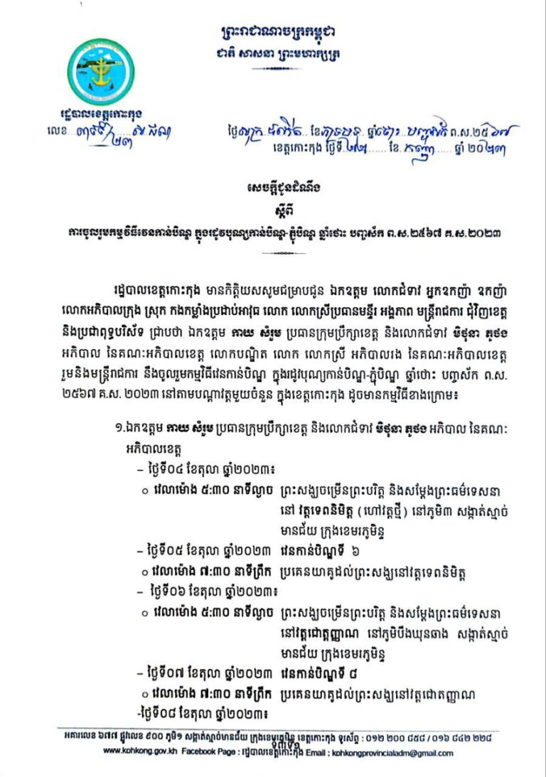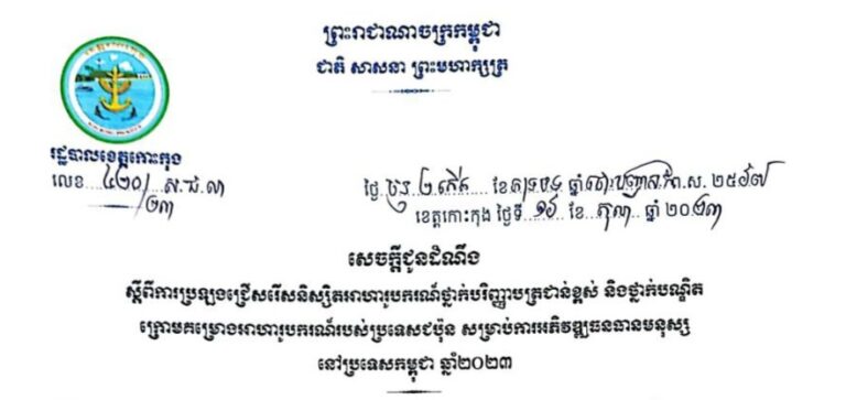 លិខិតអំពាវនាវ របស់រដ្ឋបាលខេត្តកោះកុង