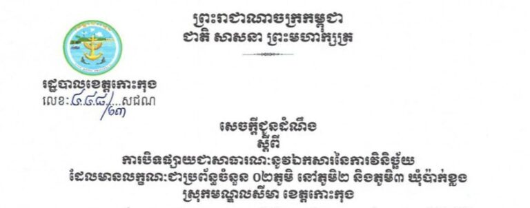 សេចក្តីជូនដំណឹង ស្តីពីការបិទផ្សាយជាសាធារណៈនូវឯកសារនៃការវិនិច្ឆ័យ ដែលមានលក្ខណៈជាប្រព័ន្ធចំនួន ០២ភូមិ នៅភូមិ២ និងភូមិ៣ ឃុំប៉ាក់ខ្លង ស្រុកមណ្ឌលសីមា ខេត្តកោះកុង