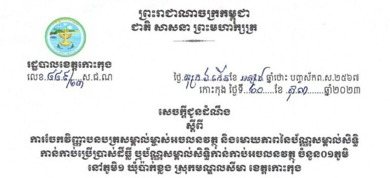 សេចក្តីជូនដំណឹង ស្តីពីការចែកវិញ្ញាបនបត្រសម្គាល់ម្ចាស់អចលនវត្ថុ និងមោឃភាពនៃប័ណ្ណសម្គាល់សិទ្ធិ កាន់កាប់ប្រើប្រាស់ដីធ្លី ឬប័ណ្ណសម្គាល់សិទ្ធិកាន់កាប់អចលនវត្ថុ ចំនួន០១ភូមិ នៅភូមិ១ ឃុំប៉ាក់ខ្លង ស្រុកមណ្ឌលសីមា ខេត្តកោះកុង