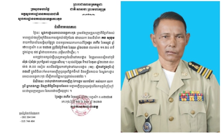 ដំណឹងមរណភាព ស្នងការដ្ឋាននគរបាលខេត្តកោះកុង ព្រមទាំងក្រុមគ្រួសារញាតិមិត្តទាំងអស់ មានទុក្ខយ៉ាងក្រៀមក្រំនិងសោកសង្វេគយ៉ាងក្រៃលែង ដោយលោក វរសេនីយ៍ទោ កង សុខុម នាយការិយាល័យសន្តិសុខផ្ទៃក្នុង បានទទួលមរណភាព