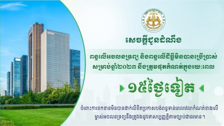 សេចក្ដីជូនដំណឹង ពន្ធលើអចលនទ្រព្យ និងពន្ធលើដីធ្លីមិនបានប្រើប្រាស់ សម្រាប់ឆ្នាំ២០២៣ នឹងត្រូវផុតកំណត់ក្នុងរយៈពេល «១៥ថ្ងៃទៀត»