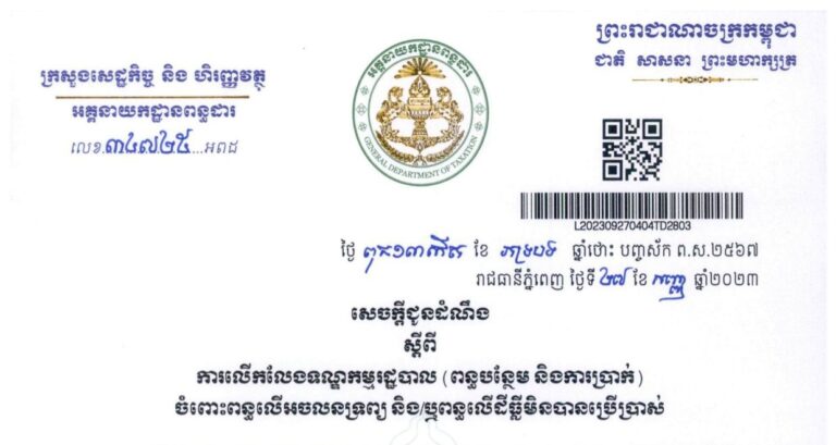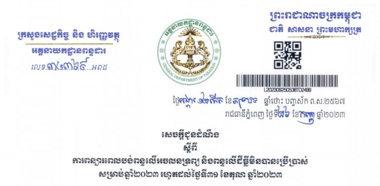 សេចក្តីជូនដំណឹង ស្តីពី ការពន្យារពេលបង់ពន្ធលើអចលនទ្រព្យ និងពន្ធលើដីធ្លីមិនបានប្រើប្រាស់ សម្រាប់ឆ្នាំ២០២៣ រហូតដល់ថ្ងៃទី៣១ ខែតុលា ឆ្នាំ២០២៣