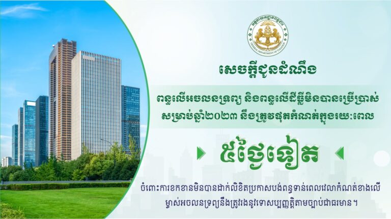 សេចក្ដីជូនដំណឹង ពន្ធលើអចលនទ្រព្យ និងពន្ធលើដីធ្លីមិនបានប្រើប្រាស់ សម្រាប់ឆ្នាំ២០២៣ នឹងត្រូវផុតកំណត់ក្នុងរយៈពេល «៥ថ្ងៃទៀត»
