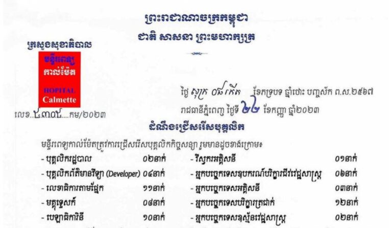 ដំណឹងជ្រើសរើសបុគ្គលិក មន្ទីរពេទ្យកាល់ម៉ែតត្រូវការជ្រើសរើសបុគ្គលិកកិច្ចសន្យា