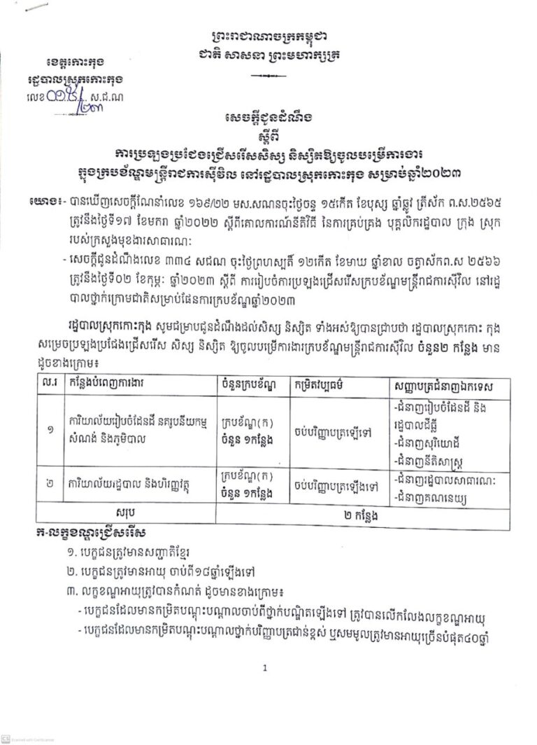សេចក្តីជូនដំណឹង ស្តីពីការប្រឡងប្រជែងជ្រើសរើសសិស្ស និស្សិតឱ្យចូលបម្រើការងារ ក្នុងក្របខ័ណ្ឌមន្ត្រីរាជការស៊ីវិល នៅរដ្ឋបាលស្រុកកោះកុង សម្រាប់ឆ្នាំ២០២៣