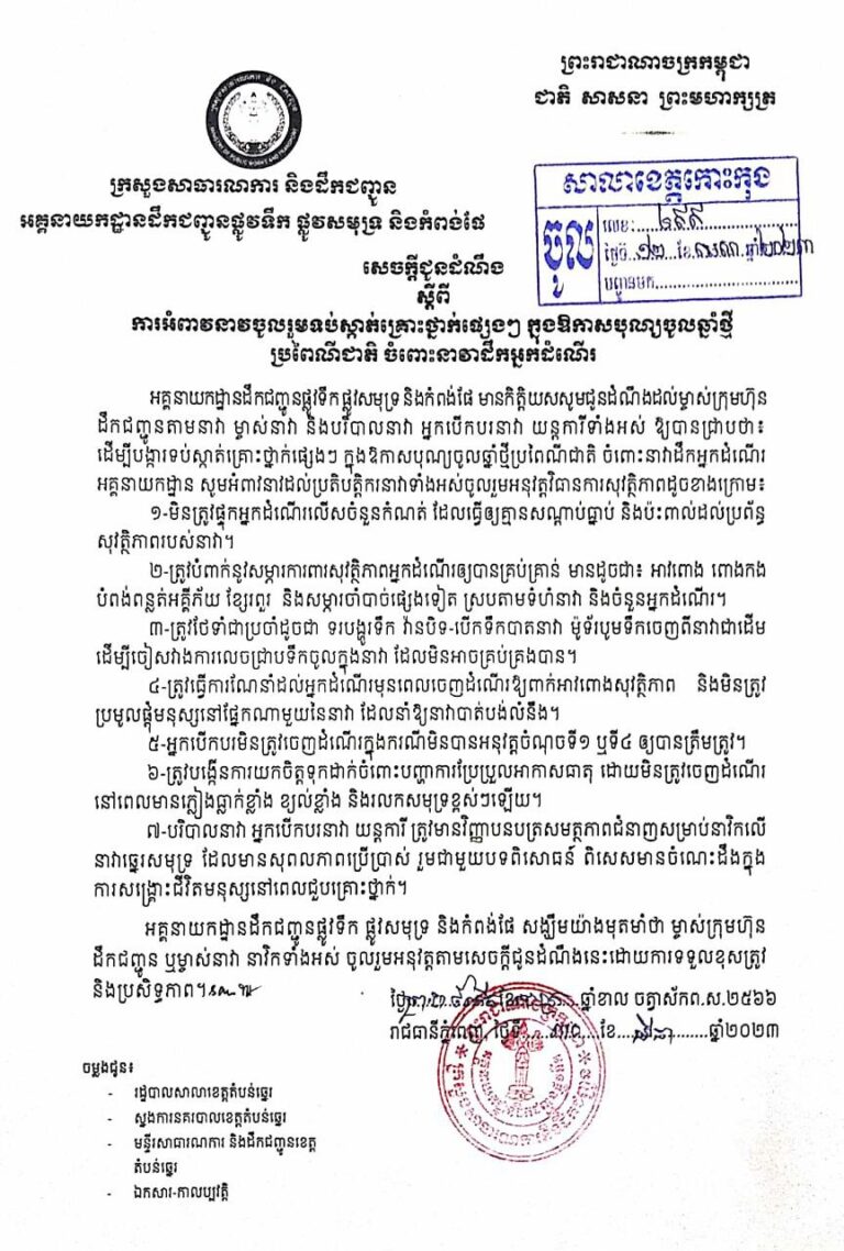 សេចក្តីជូនដំណឹង ស្តីពីការអំពាវនាវចូលរួមទប់ស្កាត់គ្រោះថ្នាក់ផ្សេងៗ ក្នុងឱកាសបុណ្យចូលឆ្នាំថ្មី ប្រពៃណីជាតិ ចំពោះនាវាដឹកអ្នកដំណើរ