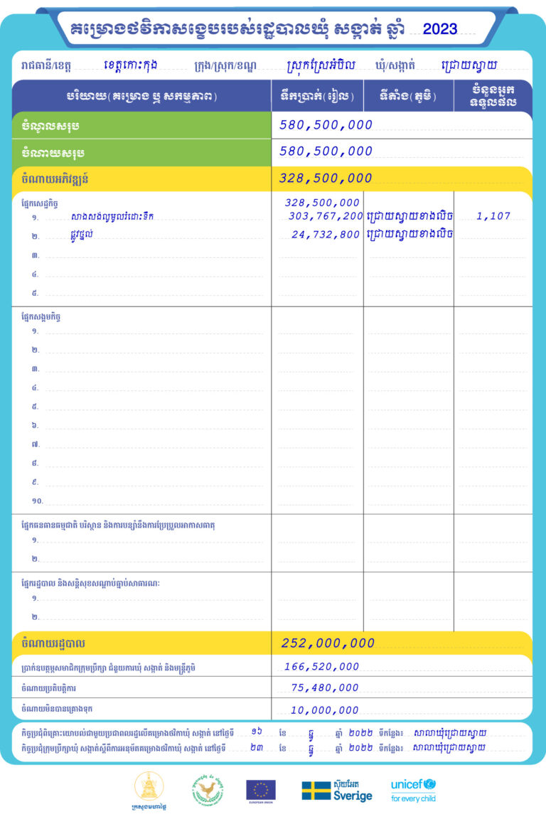 រដ្ឋបាលឃុំជ្រោយស្វាយ ស្រុកស្រែអំបិល ខេត្តកោះកុង មានកិត្តិយស ផ្សព្វផ្សាយជូនសាធារណជនអំពី គម្រោងថវិកាសង្ខេបរបស់រដ្ឋបាលឃុំ សង្កាត់ ឆ្នាំ២០២៣