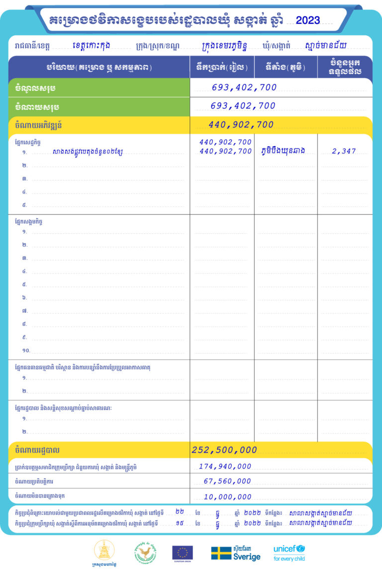 រដ្ឋបាលសង្កាត់ស្មាច់មានជ័យ ក្រុងខេមរភូមិន្ទ ខេត្តកោះកុង មានកិត្តិយស ផ្សព្វផ្សាយជូនសាធារណជនអំពី គម្រោងថវិកាសង្ខេបរបស់រដ្ឋបាលឃុំ សង្កាត់ ឆ្នាំ២០២៣