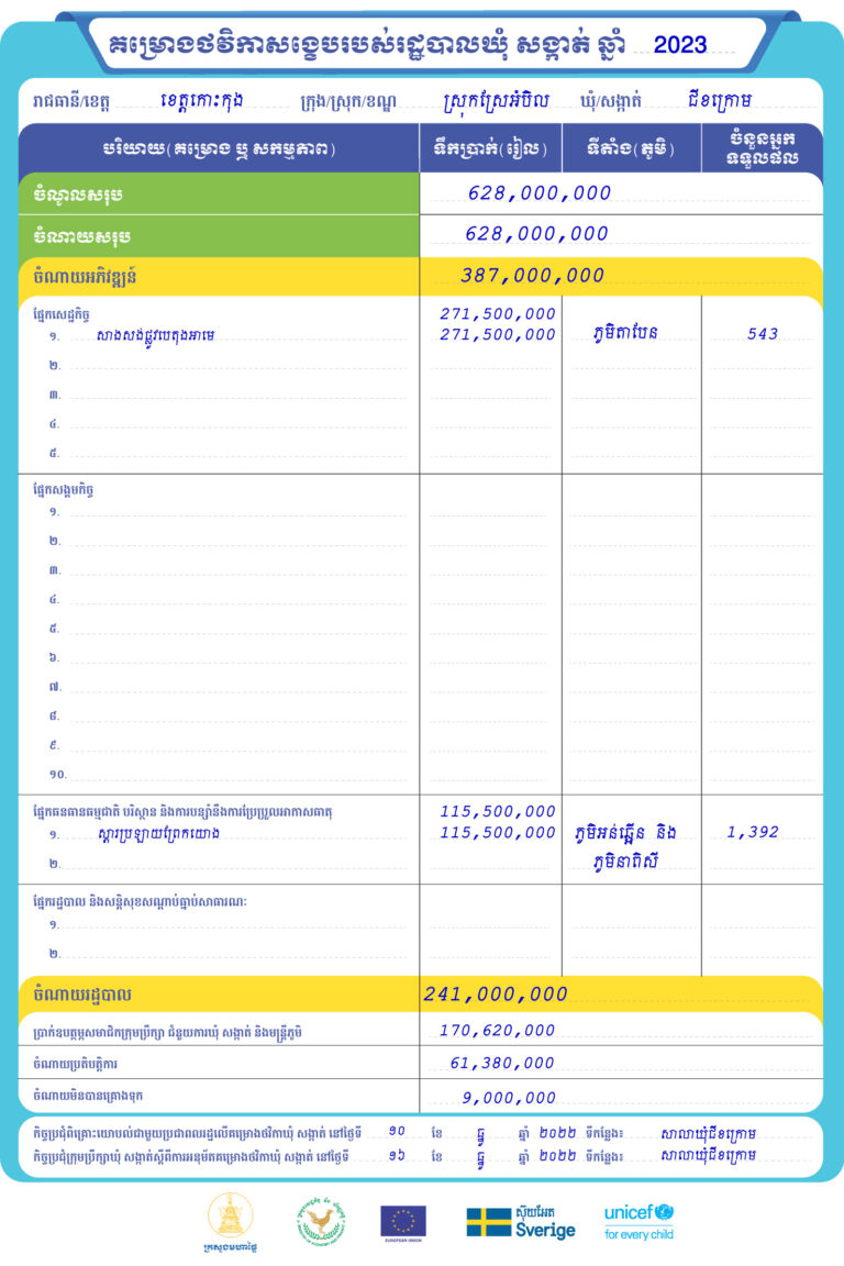 រដ្ឋបាលឃុំជីខក្រោម ស្រុកស្រែអំបិល ខេត្តកោះកុង មានកិត្តិយស ផ្សព្វផ្សាយជូនសាធារណជនអំពី គម្រោងថវិកាសង្ខេបរបស់រដ្ឋបាលឃុំ សង្កាត់ ឆ្នាំ២០២៣