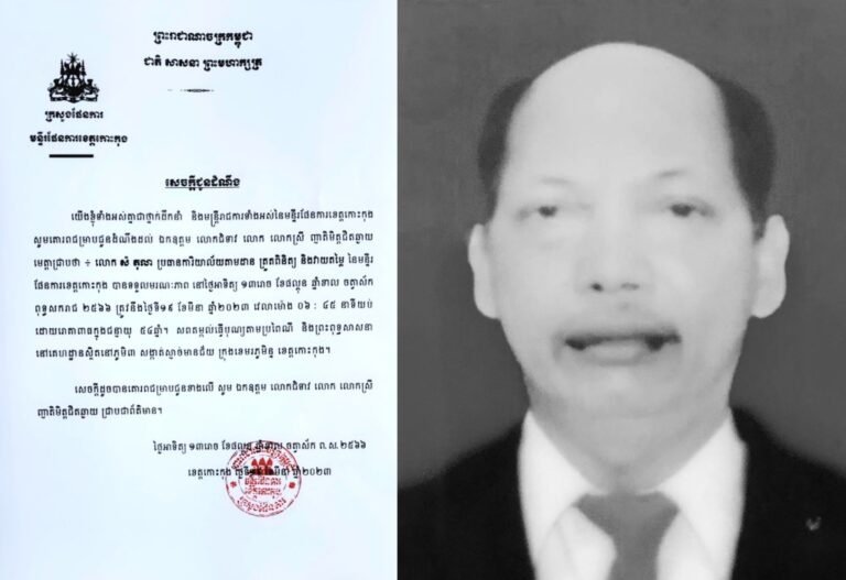 សេចក្តីជូនដំណឹង ស្តីពីដំណឹងមរណភាពរបស់លោក សំ តុលា ប្រធានការិយាល័យតាមដាន ត្រួតពិនិត្យ និងវាយតម្លៃ នៃមន្ទីរផែនការខេត្តកោះកុង