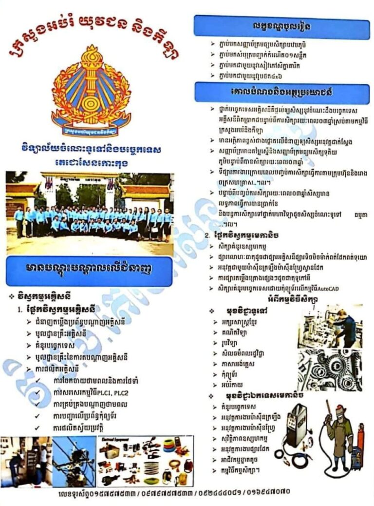 គណៈនាយកវិទ្យាល័យកោះកុង (វិទ្យាល័យចំណេះទូទៅ និងបច្ចេកទេសតេជោសែនកោះកុង) មានកិត្តិយស សូមជម្រាបដល់ មាតា បិតាអាណាព្យាបាលសិស្ស និងសិស្សានុសិស្ស ដែលមានសញ្ញាប័ត្រមធ្យមសិក្សាបឋមភូមិ និងមានបំណងចូលរៀនថ្នាក់បច្ចេកទេសថា នៅឆ្នាំសិក្សាថ្មី២០២២-២០២៣ សាលាមានបើកវគ្គបណ្ដុះបណ្ដាលជំនាញ អគ្គីសនី និងមេកានិច ដោយឥតគិតថ្លៃ សម្រាប់សិស្សថ្មីឆ្នាំទី១ (មានកន្លែងស្នាក់នៅ និងអាហារពីរពេលសម្រាប់សិស្សនៅឆ្ងាយ)។សូមមកទទួល និងដាក់ពាក្យចាប់ពីថ្ងៃជូនដំណឹងតទៅរៀងរាល់ម៉ោងធ្វើការនៅទីចាត់ការសាលា។ទំនាក់ទំនងទូរសព្ទលេខ គណៈនាយក 015757533 ,0979 757533,016947070។សូមអរគុណ !