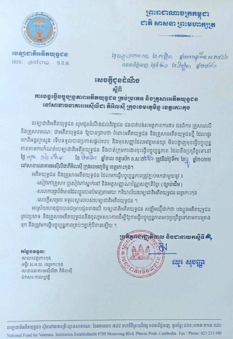 សេចក្តីជូនដំណឹង ស្តីពីការបន្តធ្វើបច្ចុប្បន្នភាពអតីតយុទ្ធជន គ្រប់ប្រភេទ និងគ្រួសារអតីតយុទ្ធជន នៅសាខាធនាគារអេស៊ីលីដា ភីអិលស៊ី ក្រុងខេមរភូមិន្ទ ខេត្តកោះកុង