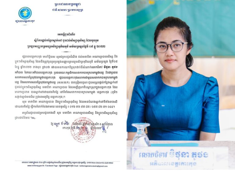 សេចក្តីជូនដំណឹង របស់រដ្ឋបាលខេត្តកោះកុង ក្នុងការលើកទឹកចិត្ត ដល់ប្អូនៗ និងក្មួយៗសិស្សានុសិស្សទាំងអស់ ដែលខិតខំសិក្សារៀនសូត្រ
