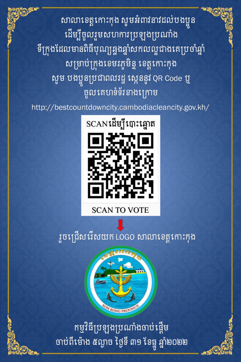 រដ្ឋបាលខេត្តកោះកុង សូមអំពាវនាវដល់បងប្អូន ដើម្បីចូលរួមសហការប្រឡងប្រណាំងទីក្រុងដែលមានពិធីបុណ្យឆ្លងឆ្នាំសកលល្អជាងគេប្រចាំឆ្នាំសម្រាប់ក្រុងខេមរភូមិន្ទ ខេត្តកោះកុង សូម បងប្អូនប្រជាពលរដ្ឋ ស្កេននូវ QR Code ឬចូលគេហទំទ័រខាងក្រោមhttp://bestcountdowncity.cambodiacleancity.gov.kh/ រួចជ្រើសរើសយក LOGO រដ្ឋបាលខេត្តកោះកុង