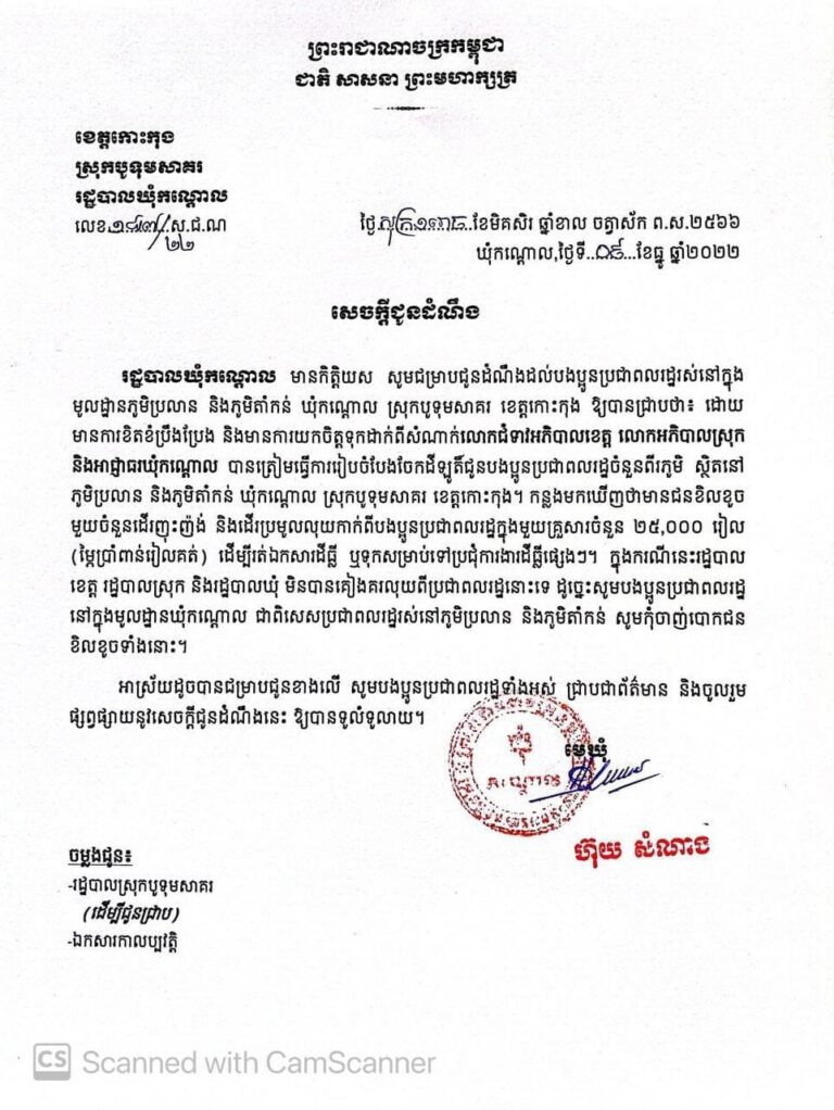 សេចក្តីជូនដំណឹងលេខ១៨៧/២២ ស.ជ.ណ រដ្ឋបាលឃុំកណ្ដាល មានកិត្តិយស សូមជម្រាបជូនដំណឹងដល់បងប្អូនប្រជាពលរដ្ឋរស់នៅក្នុង មូលដ្ឋានភូមិប្រលាន និងភូមិតាំកន់ ឃុំកណ្តោល ស្រុកបូទុមសាគរ ខេត្តកោះកុង ឱ្យបានជ្រាបថា៖ ដោយ មានការខិតខំប្រឹងប្រែង និងមានការយកចិត្តទុកដាក់ពីសំណាក់លោកជំទាវអភិបាលខេត្ត លោកអភិបាលស្រុក និងអាជ្ញាធរឃុំកណ្តាល បានត្រៀមធ្វើការរៀបចំបែងចែកដីឡូតិ៍ជូនបងប្អូនប្រជាពលរដ្ឋចំនួនពីរភូមិ ស្ថិតនៅ ភូមិប្រលាន និងភូមិតាំកន់ ឃុំកណ្តោល ស្រុកបូទុមសាគរ ខេត្តកោះកុង