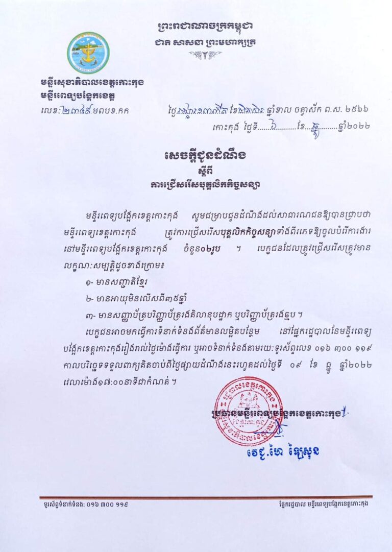 សេចក្តីជូនដំណឹង ស្តីពីការជ្រើសរើសបុគ្គលិកកិច្ចសន្យាមន្ទីរពេទ្យបង្អែកខេត្តកោះកុង