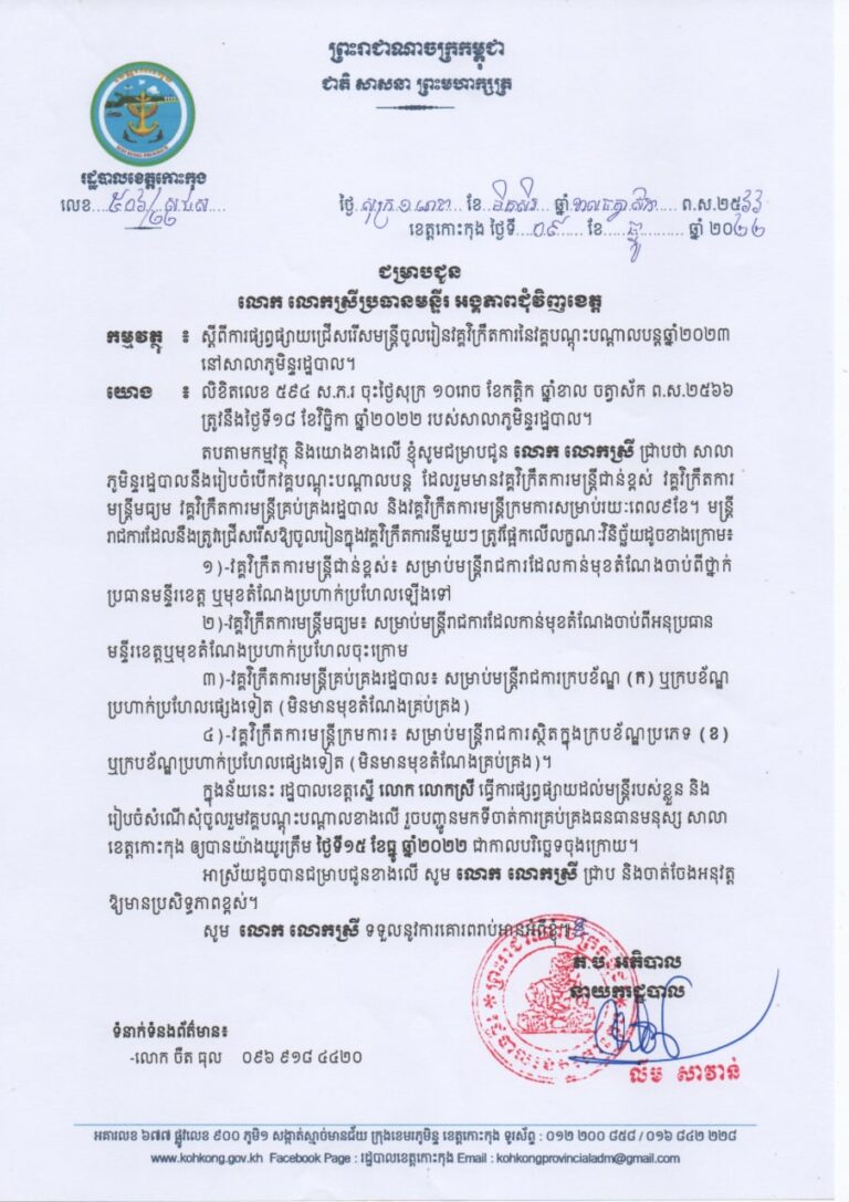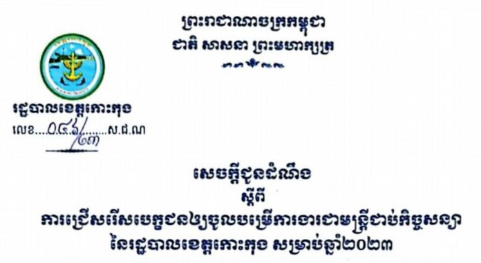 សេចក្តីជូនដំណឹង ស្តីពីការជ្រើសរើសបេក្ខជនឱ្យចូលបម្រើការងារ ជាមន្ត្រីជាប់កិច្ចសន្យា នៃរដ្ឋបាលខេត្តកោះកុង សម្រាប់ឆ្នាំ២០២៣