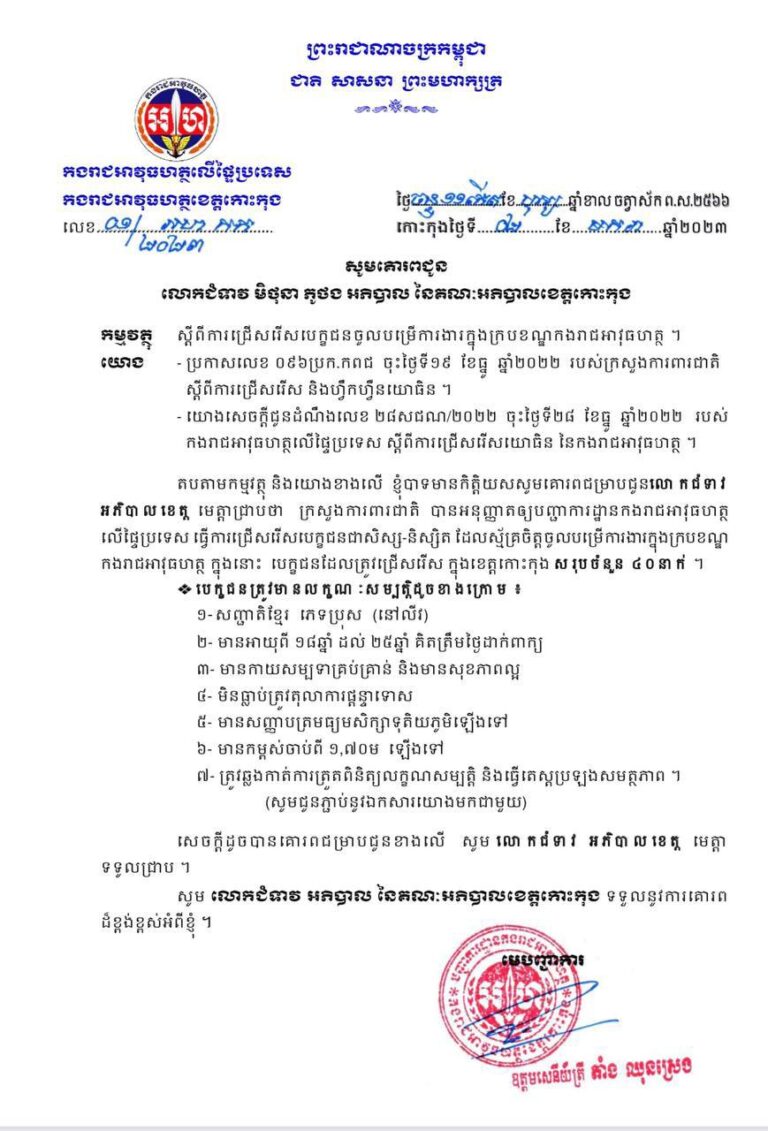 សេចក្តីជូនដំណឹង ស្តីពីការជ្រើសរើសបេក្ខជនចូលបម្រើការងារ ក្នុងក្របខណ្ឌកងរាជអាវុធហត្ថខេត្តកោះកុង