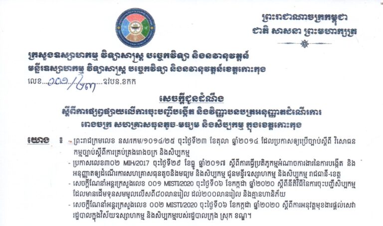 សេចក្តីជូនដំណឹងស្តីពីការផ្សព្វផ្សាយលើការចុះបញ្ជី និងវិញ្ញាបនបត្រអនុញ្ញាតដំណើរការ រោងចក្រ សហគ្រាសធុនតូច មធ្យម និង សិប្បកម្ម ក្នុងខេត្តកោះកុង