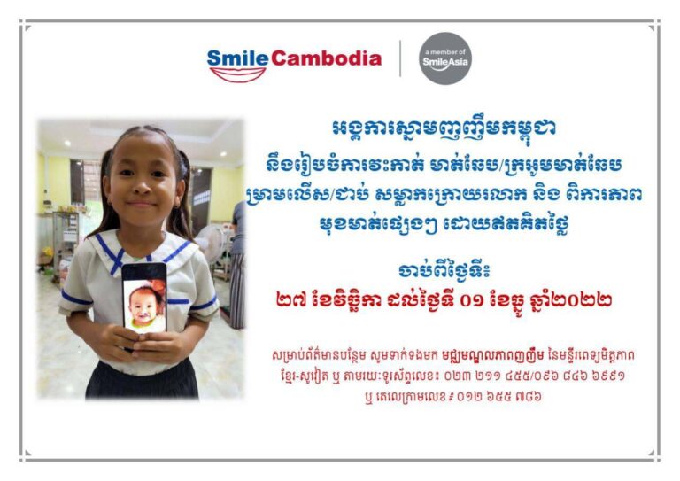 អង្គការស្នាមញញឹមកម្ពុជា នឹងរៀបចំការវះកាត់ មាត់ឆែប/ក្រអូមមាត់ឆែប ម្រាមលើស/ជាប់ សម្លាកក្រោយរលាក និង ពិការភាព មុខមាត់ផ្សេងៗ ដោយឥតគិតថ្លៃ