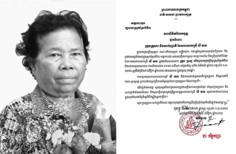 ក្នុងនាមក្រុមប្រឹក្សាស្រុក គណៈអភិបាលស្រុក មន្ត្រីរាជការ កងកម្លាំងប្រដាប់អាវុធទាំងបីប្រភេទ និងប្រជាពលរដ្ឋទាំងអស់ក្នុងស្រុកស្រែអំបិល ខេត្តកោះកុង មានសេចក្ដីសោកស្ដាយ អាឡោះអាល័យ និងក្រៀមក្រំ ជាទីបំផុត ចំពោះមរណភាព លោកស្រី លី មាន ត្រូវជាភរិយារបស់លោក គ្រួច ប្រាជ្ញ អតីតប្រធានក្រុមប្រឹក្សាស្រុកស្រែអំបិល ដែលបានទទួលមរណភាព កាលពីវេលាម៉ោង ១១:២០ នាទីយប់ នាថ្ងៃអាទិត្យ ៤កើត ខែមិគសិរ ឆ្នាំខាល ចត្វាស័ក ព.ស.២៥៦៦
