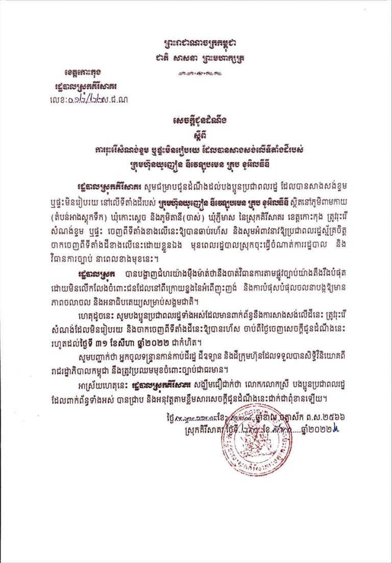រដ្ឋបាលស្រុកគិរីសាគរ សេចក្ដីជូនដំណឹងស្ដីពីការរុះរើសំណង់ខ្ទម ឫផ្ទះមិនរៀបរយ ដែលបានសាងសង់លើទីតាំងដីរបស់ក្រុមហ៊ុនយូញៀន ឌីវេឡុបមេន គ្រុប ខូអិលធីឌី