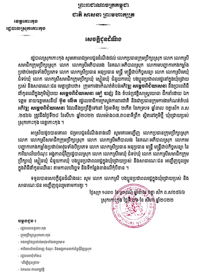 សេចក្តីជូនដំណឹង ស្តីពី​ការដាំកូនឈើក្នុងភូមិរៀបរយ សម្ដេចពិជ័យសេនា ទៀ បាញ់ និងតំបន់ប្រវត្តិសាស្ត្រយោធា នៅភូមិថ្មី ឃុំជ្រោយប្រស់ ស្រុកកោះកុង ខេត្តកោះកុង​
