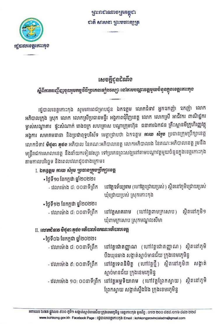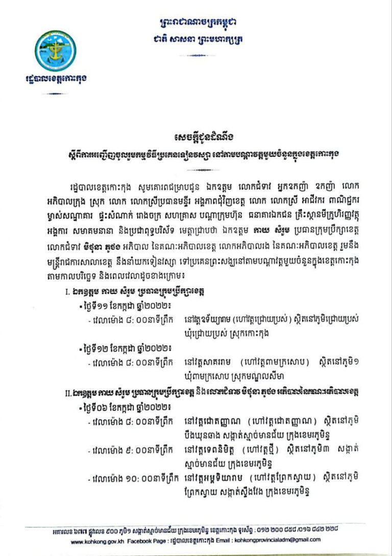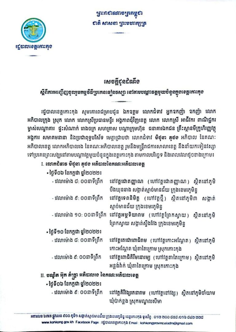 សេចក្តីជូនដំណឹង ស្ដីពីការអញ្ជើញចូលរួមកម្មវិធីប្រគេនទៀនវស្សា នៅតាមបណ្តាវត្តមួយចំនួនក្នុងខេត្តកោះកុង