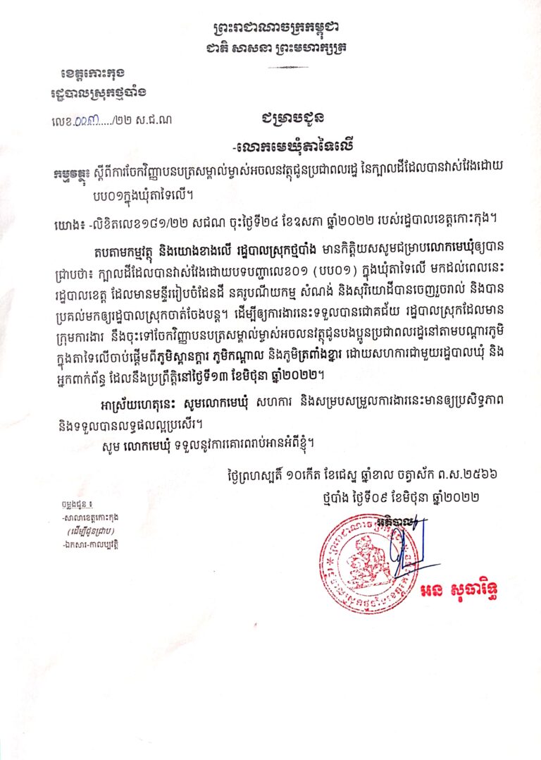 សេចក្តីជូនដំណឹងស្ដីពីការចែកវិញ្ញាបនបត្រសម្គាល់ម្ចាស់អចលនទ្រព្យនៃក្បាលដីដែលបានវាស់វែងដោយបប០១ក្នុងឃុំតាទៃលើ ស្រុកថ្មបាំង