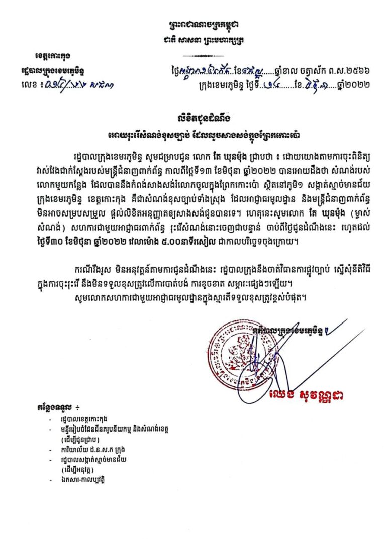 លិខិតជូនដំណឹង ឱ្យរុះសំណង់ច្បាប់ ដែលសាងសង់ក្នុងព្រែកកោះប៉ោ