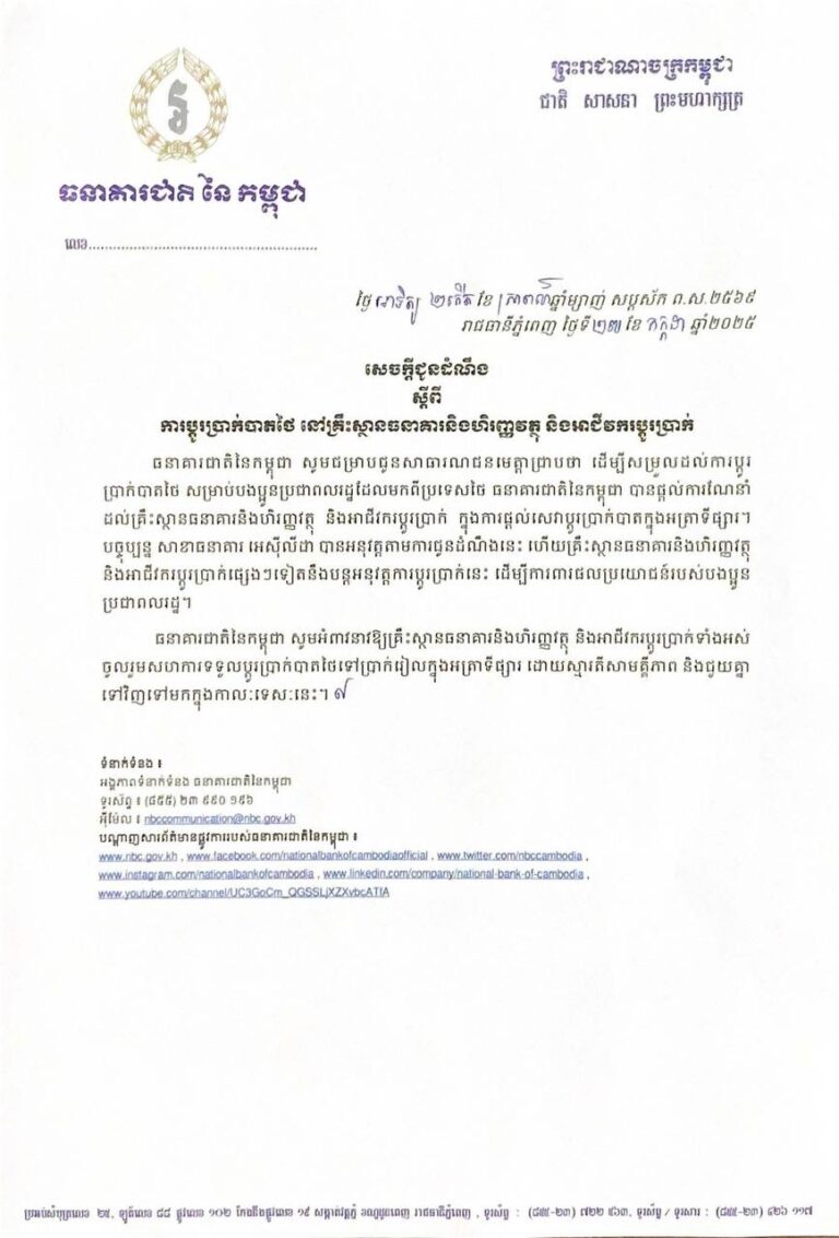 សេចក្តីជូនដំណឹង ស្តីពីការប្តូរប្រាក់បាតថៃ នៅសាខាក្រុមហ៊ុនក្នុងស្រុក ធនាគារ អេស៊ីលីដា ភីអិលស៊ី (សាខាខេត្តកោះកុង) ចាប់ផ្តើមពីវេលាម៉ោង ១៥:០០ នាទីរសៀល រហូតដល់ម៉ោង ១៦:០០ នាទីល្ងាច ថ្ងៃទី២៧ ខែកក្កដា ឆ្នាំ២០២៥ និងសម្រាប់ថ្ងៃចន្ទ រហូតដល់ថ្ងៃសុក្រ ចាប់ពីម៉ោង ០៧:៣០ នាទី ដល់ម៉ោង ១៦:០០ នាទីល្ងាច