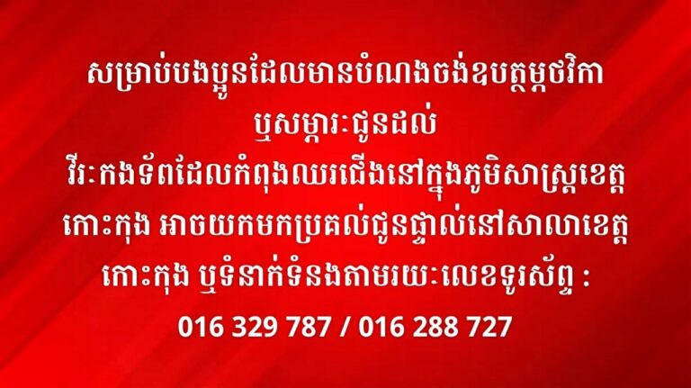 សម្រាប់បងប្អូនដែលមានបំណងចង់ឧបត្ថម្ភថវិកា ឬសម្ភារ ជូនដល់វីរៈកងទ័ព ដែលកំពុងឈរជើងនៅក្នុងភូមិសាស្ត្រខេត្តកោះកុង អាចយកមកប្រគល់ជូនផ្ទាល់នៅសាលាខេត្ត កោះកុង ឬទំនាក់ទំនងតាមរយៈលេខទូរស័ព្ទ÷ 016329787 / 016288 727