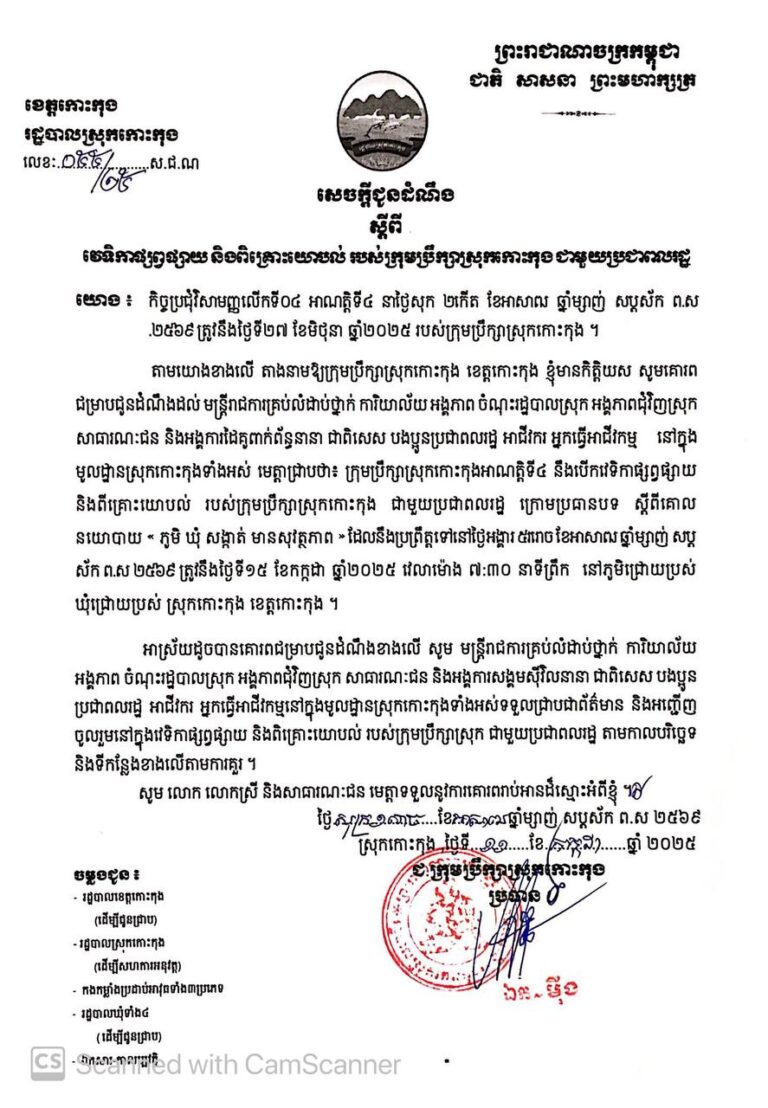 សេចក្តីជូនដំណឹង ស្តីពីវេទិការផ្សព្វផ្សាយ និងពិគ្រោះយោបល់ របស់ក្រុមប្រឹក្សាស្រុកកោះកុង