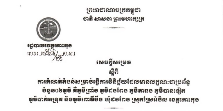 សេចក្តីសម្រេច ស្តីពីការកំណត់តំបន់សម្រាប់ធ្វើការវិនិច្ឆ័យដែលមានលក្ខណៈជាប្រព័ន្ធ ចំនួន០៦ភូមិ គឺភូមិព្រាំង ភូមិដងពែង ភូមិតាធង ភូមិបានទៀត ភូមិបាក់អង្រុត និងភូមិពោធិ៍បឹង ឃុំដងពែង ស្រុកស្រែអំបិល ខេត្តកោះកុង