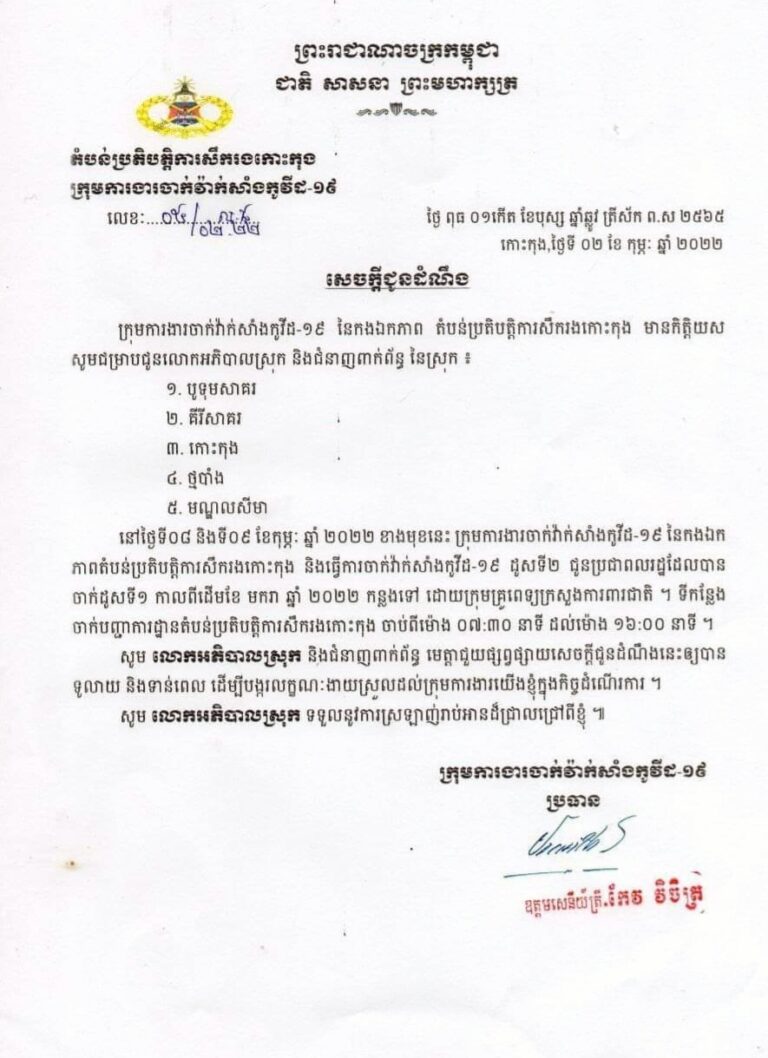 សេចក្តីជូនដំណឹង របស់ក្រុមការងារចាក់វ៉ាក់សាំងកូវីដ-១៩ នៃកងឯកភាព តំបន់ប្រតិបត្តិការសឹករងកោះកុង