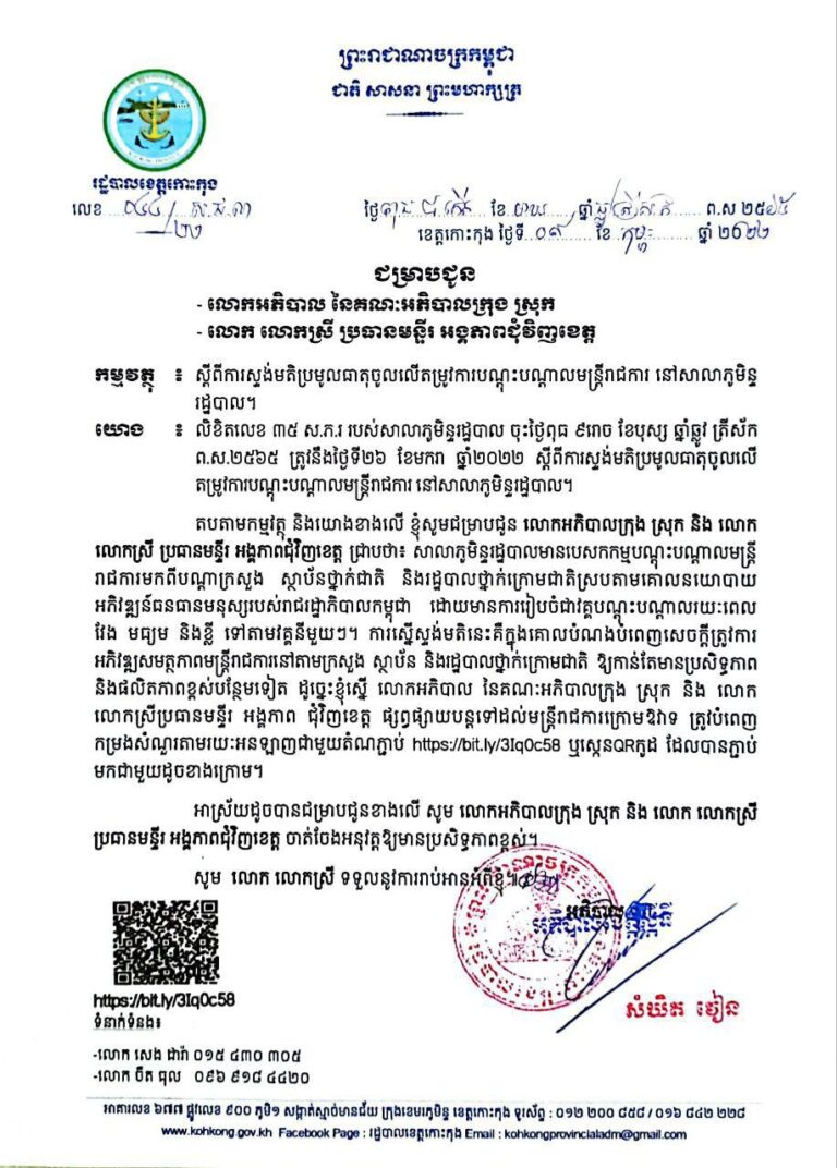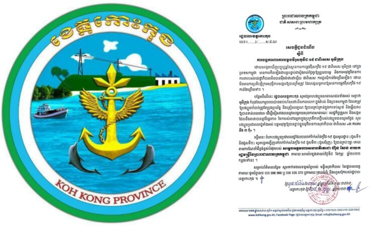 សេចក្តីជូនដំណឹង របស់រដ្ឋបាលខេត្តកោះកុង ស្តីពីការបន្តអនុវត្តឱ្យបានខ្ជាប់ខ្ជួន នូវវិធានការសុខាភិបាល ជាពិសេស «៣ ការពារ និង ៣ កុំ» និងការអញ្ជើញប្រជាពលរដ្ឋាទៅចាក់វ៉ាក់សាំងកូវីដ-១៩ ដូសទី៣ (ដូសជំរុញ) ឱ្យបានគ្រប់ៗគ្នា គោរពតាមការណែនាំដ៏ខ្ពង់ខ្ពស់បំផុតរបស់ សម្តេចអគ្គមហាសេនាបតីតេជោ ហ៊ុន សែន នាយករដ្ឋមន្ត្រី នៃព្រះរាជាណាចក្រកម្ពុជា