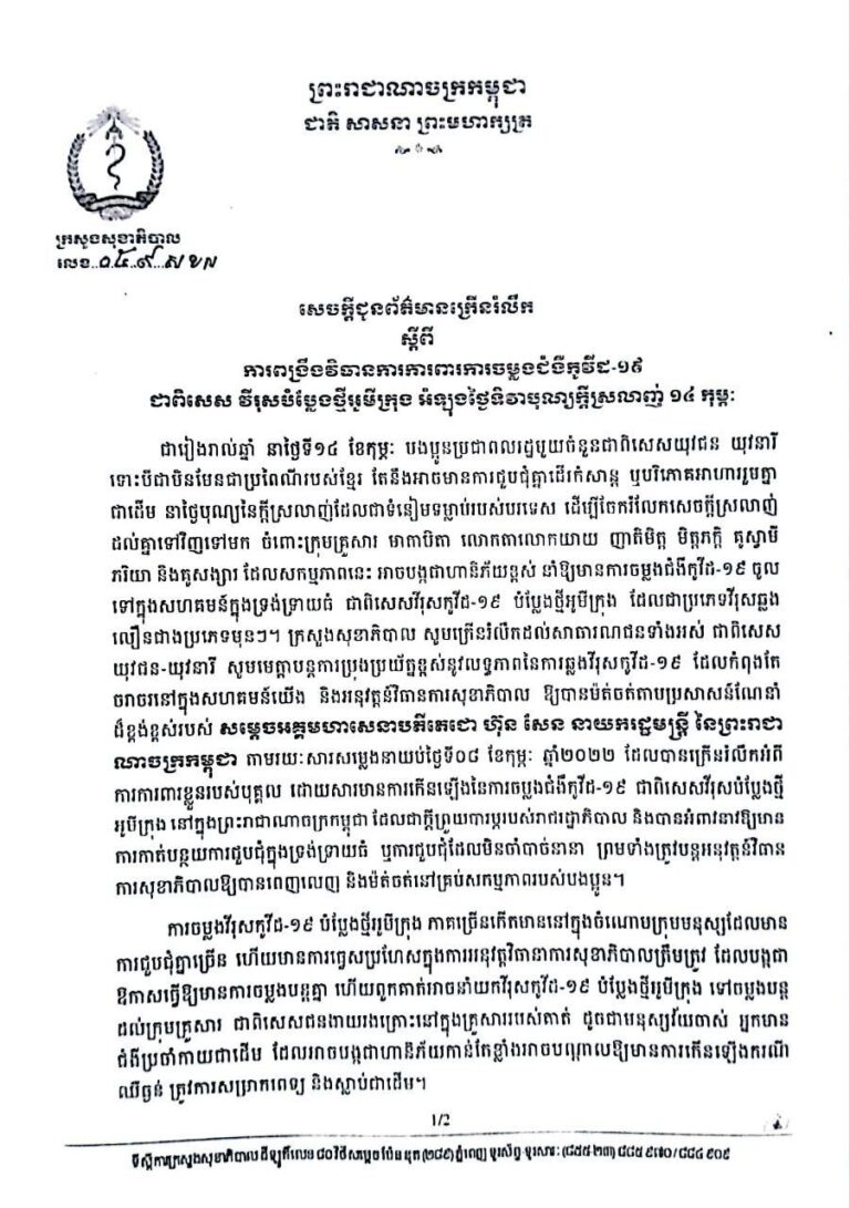 សេចក្តីជូនព័ត៌មានក្រើនរំលឹក ស្តីពីការការពង្រឹងវិធានការការពារការចម្លងជំងឺកូវីដ-១៩ ជាពិសេស វីរុសបំប្លែងថ្មីមីក្រុង អំឡុងថ្ងៃទិវាបុណ្យក្តីស្រលាញ់ ១៤ កុម្ភៈ