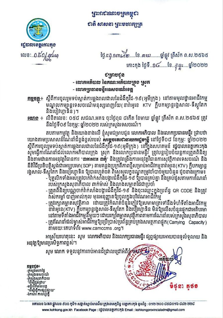 សេចក្តីជូនដំណឹង ស្តីពីការចូលរួមទប់ស្កាត់ការឆ្លងរាលដាលនៃជំងឺកូវីដ-១៩(អូមីក្រុង) នៅតាមមូលដ្ឋានអាជីវកម្ម មណ្ឌលកម្សាន្តទេសចរណ៍មនុស្សពេញវ័យ(ខារ៉ាអូខេ KTV ក្លឹបកម្សាន្តរង្គសាល-ឌីស្កូតែក និងបៀរហ្គាឌិន)