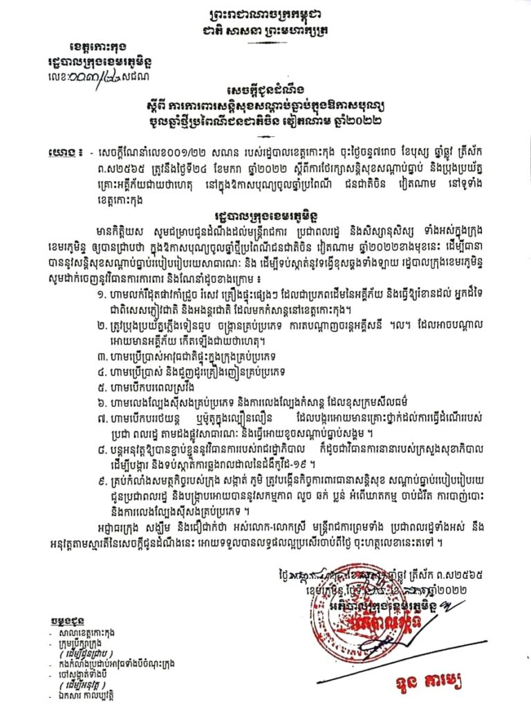 សេចក្តីជូនដំណឹង របស់រដ្ឋបាលក្រុងខេមរភូមិន្ទ ស្ដីពីការការពារសន្តិសុខសណ្ដាប់ធ្នាប់ក្នុងឱកាសបុណ្យចូលឆ្នាំប្រពៃណីជនជាតិចិន វៀតណាម ឆ្នាំ២០២២