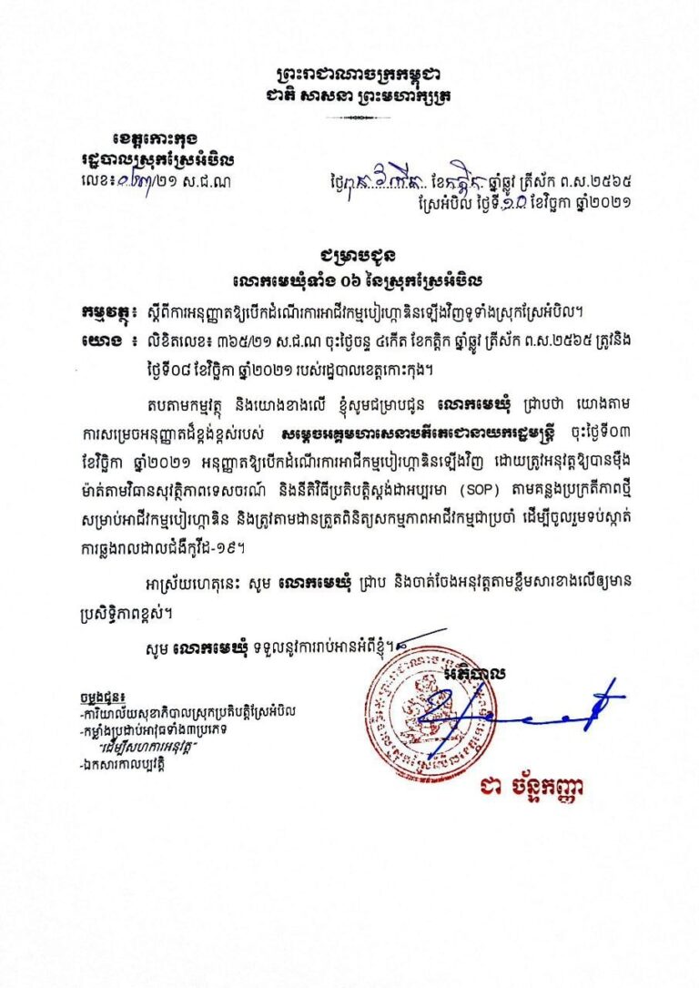 សេចក្ដីជូនដំណឹង ស្ដីពីការអនុញ្ញាតឲ្យបើកដំណើរការ អាជីវកម្មបៀរហ្កាឌិន ឡើងវិញ ទូទាំងស្រុកស្រែអំបិល