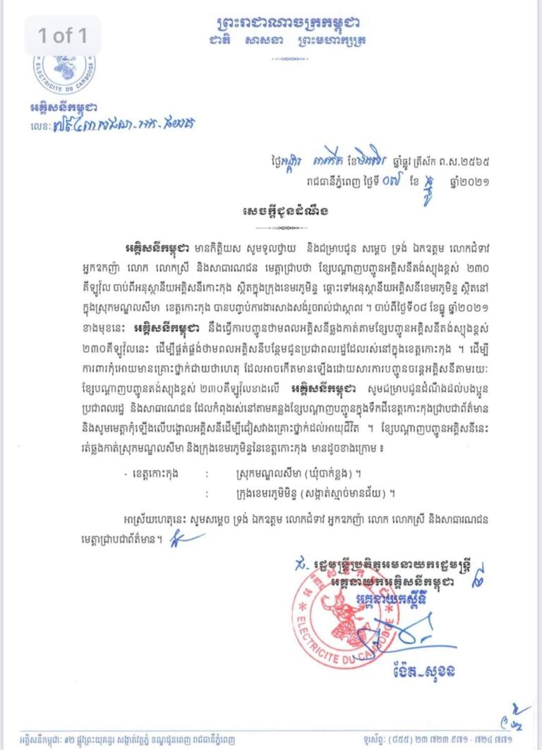 សេចក្តីជូនដំណឹង របស់អគ្គិសនីកម្ពុជា