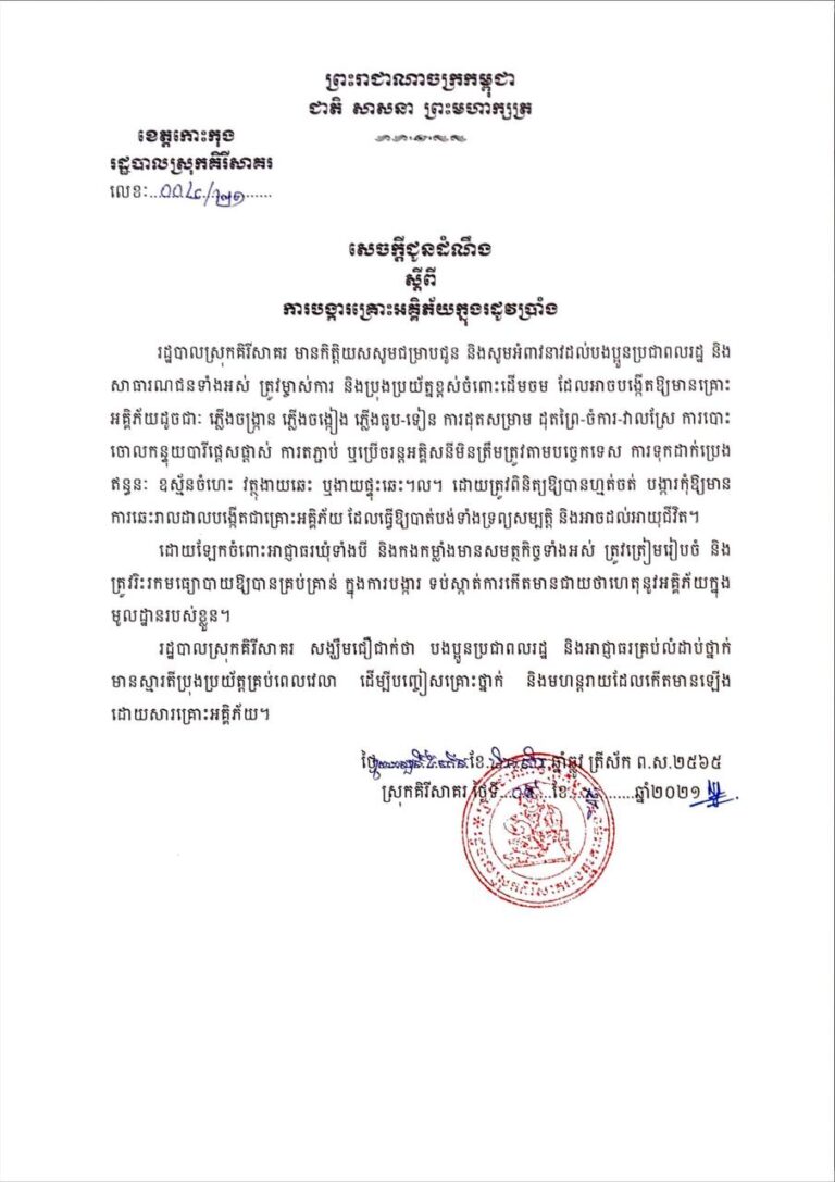 រដ្ឋបាលស្រុកគិរីសាគរសេចក្ដីជូនដំណឹងស្ដីពីការបង្ការគ្រោះអគ្គិភ័យក្នុងរដូវប្រាំង