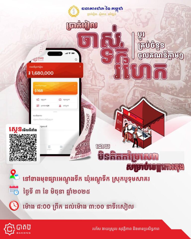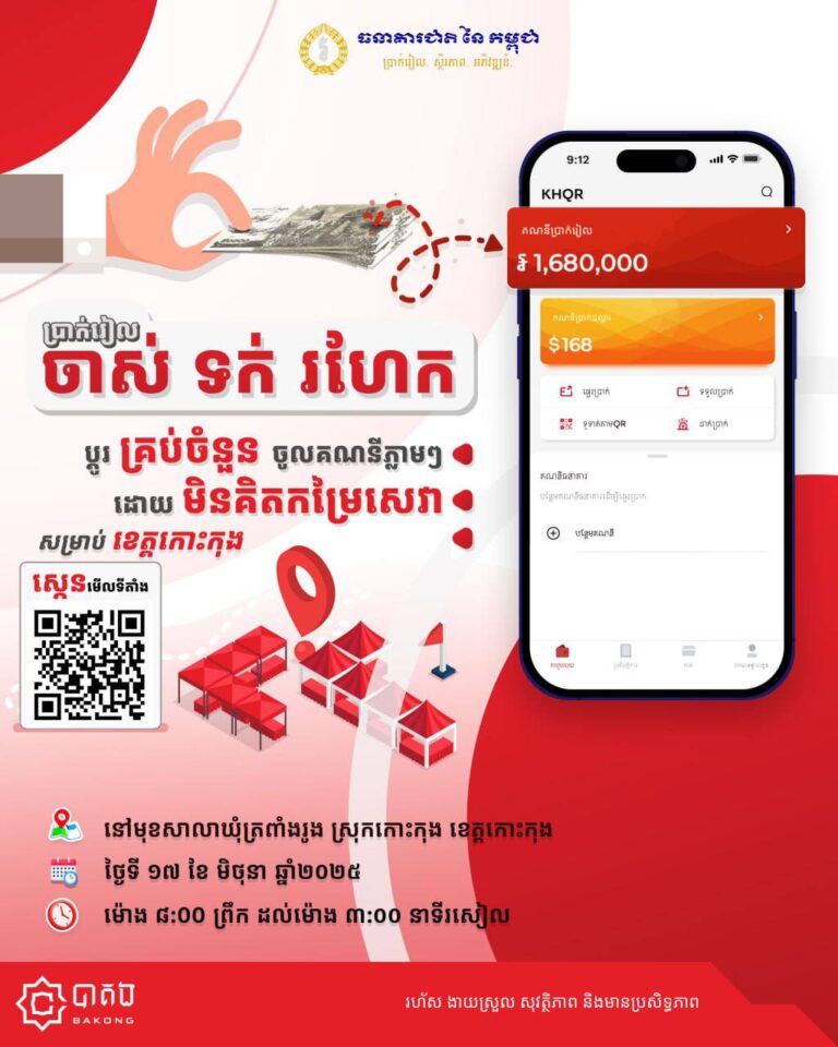 សាខាធនាគារជាតិនៃកម្ពុជាខេត្តកោះកុង សហការជាមួយគ្រឹះស្ថានធនាគារនិងហិរញ្ញវត្តុជាសមាជិក បាគង KHQR រៀបចំកម្មវិធីប្តូរក្រដាសប្រាក់រៀល ចាស់ ទក់ រហែក ចូលក្នុងគណនីបាគងឬធនាគារដែលជាសមាជិក ដោយមិនគិតកម្រៃសេវា