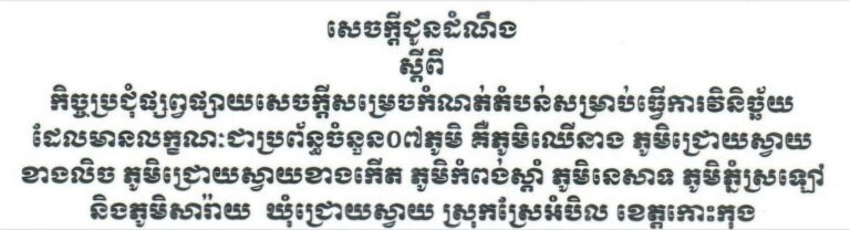 សេចក្តីជូនដំណឹង ស្តីពីកិច្ចប្រជុំផ្សព្វផ្សាយសេចក្តីសម្រេចកំណត់តំបន់សម្រាប់ធ្វើការវិនិច្ឆ័យ ដែលមានលក្ខណៈជាប្រព័ន្ធចំនួន០៧ភូមិ គឺភូមិឈើនាង ភូមិជ្រោយស្វាយខាងលិច ភូមិជ្រោយស្វាយខាងកើត ភូមិកំពង់ស្តាំ ភូមិនេសាទ ភូមិភ្នំស្រឡៅ និងភូមិសារ៉ាយ ឃុំជ្រោយស្វាយ ស្រុកស្រែអំបិល ខេត្តកោះកុង