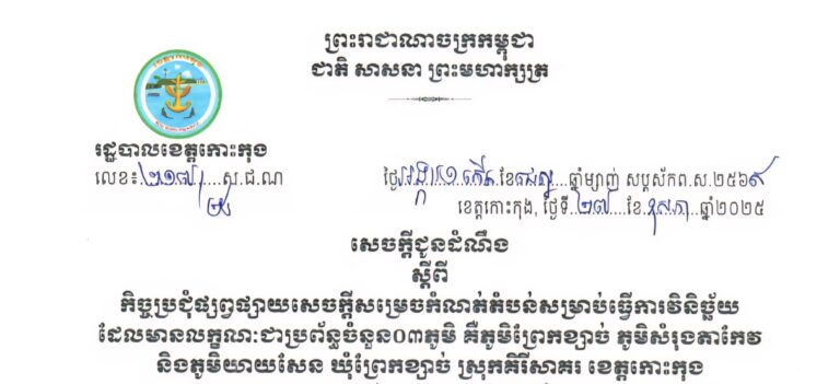 សេចក្តីជូនដំណឹង ស្តីពីកិច្ចប្រជុំផ្សព្វផ្សាយសេចក្តីសម្រេចកំណត់តំបន់សម្រាប់ធ្វើការវិនិច្ឆ័យ ដែលមានលក្ខណៈជាប្រព័ន្ធចំនួន០៣ភូមិ គឺភូមិព្រែកខ្សាច់ ភូមិសំរុងតាកែវ និងភូមិយាយសែន ឃុំព្រែកខ្សាច់ ស្រុកគិរីសាគរ ខេត្តកោះកុង