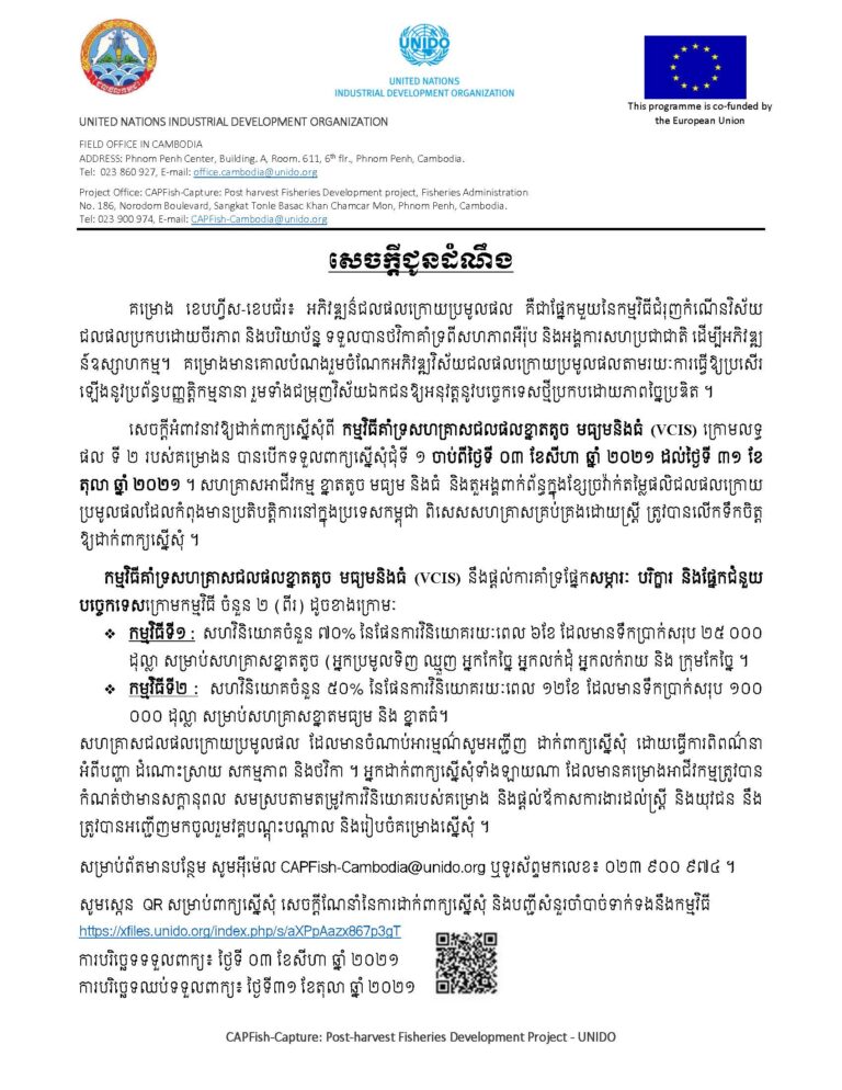 មន្ទីរកសិកម្ម រុក្ខាប្រមាញ់ និងនេសាទខេត្តកោះកុង៖ សេចក្តីជូនដំណឹង អំពាវនាវឱ្យសហគ្រាស អាជីវកម្ម ខ្នាតតូច មធ្យម និងធំ និងតួអង្គពាក់ព័ន្ធក្នុងខ្សែច្រវ៉ាក់តម្លៃផលិតផលជលផលក្រោយប្រមូលផលដែលកំពុង មានប្រតិបត្តិការនៅក្នុងប្រទេសកម្ពុជា
