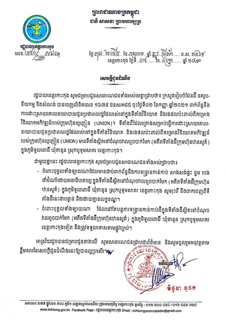 សេចក្តីជូនដំណឹង របស់រដ្ឋបាលខេត្តកោះកុង