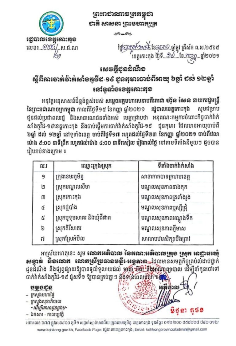 សេចក្តីជូនដំណឹង និងផែនការ ស្តីពីការចាក់វ៉ាក់សាំងកូវីដ-១៩ ជូនកុមារចាប់ពីអាយុ ៦ឆ្នាំ ដល់ ១២ឆ្នាំ នៅខេត្តកោះកុង ចាប់ពីថ្ងៃទី១៧ រហូតដល់ថ្ងៃទី២៣ ខែកញ្ញា ឆ្នាំ២០២១