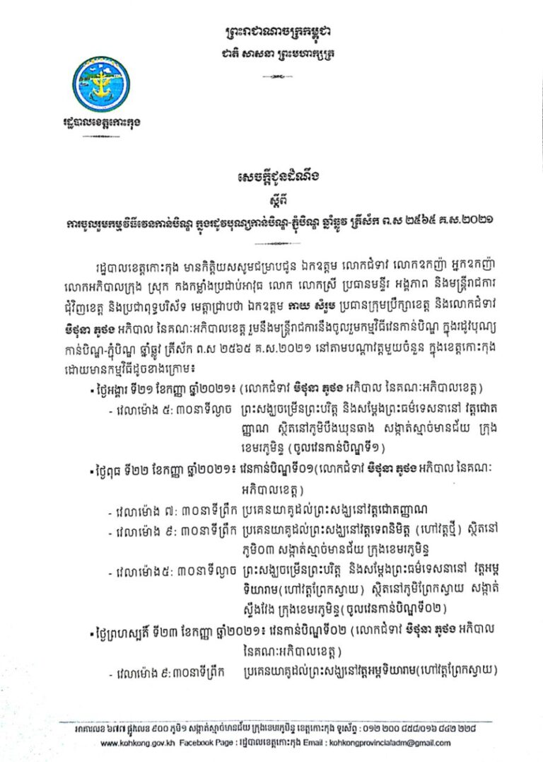 សេចក្តីជូនដំណឹង ស្តីពីការចូលរួមកម្មវិធីវេនកាន់បិណ្ឌ ក្នុងរដូវបុណ្យកាន់បិណ្ឌ ឆ្នាំឆ្លូវ ត្រីស័ក ព.ស.២៥៦៥ គ.ស.២០២១